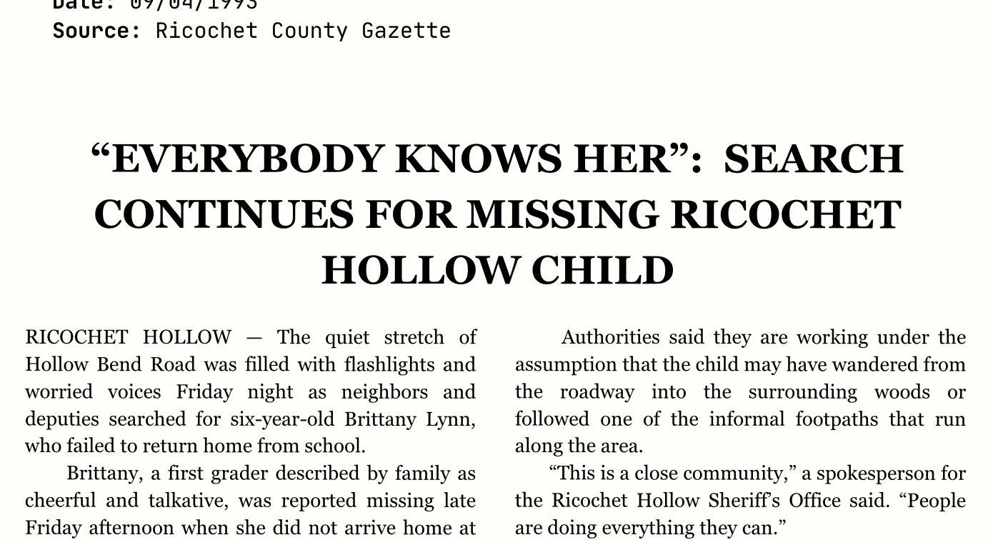 Brittany is described as six years old, with light blonde hair, and was last seen wearing a red shirt and pink pants. Anyone with information is asked to contact the Ricochet Hollow Sheriff’s Office via the tip line number: 555-555-982.